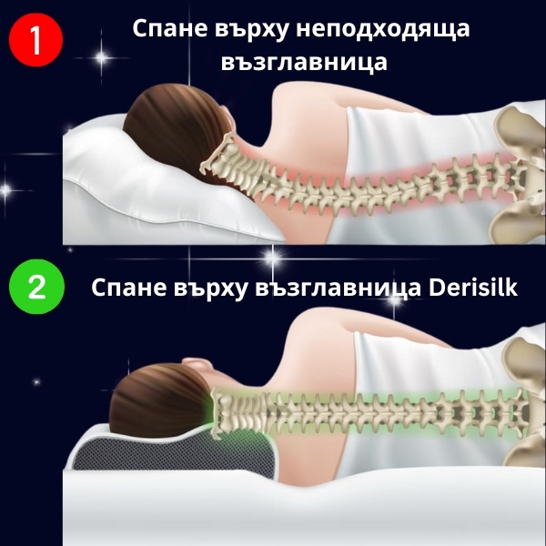 Кажете сбогом на сутрешната болка! Derisilk поддържа естествените извивки на врата и раменете, облекчава напрежението и осигурява комфорта, от който се нуждаете за безболезнена сутрин.